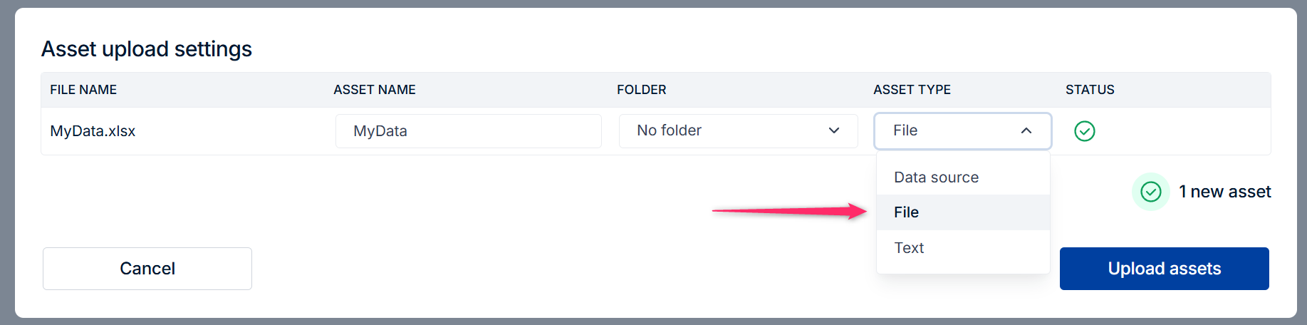 Upload the file that contains the data for your data source as a file asset (make sure that the Asset Type is set to “File”). It must be a file with one of the supported file types.-3ff075fc662f30230b46e319384748a7.png)