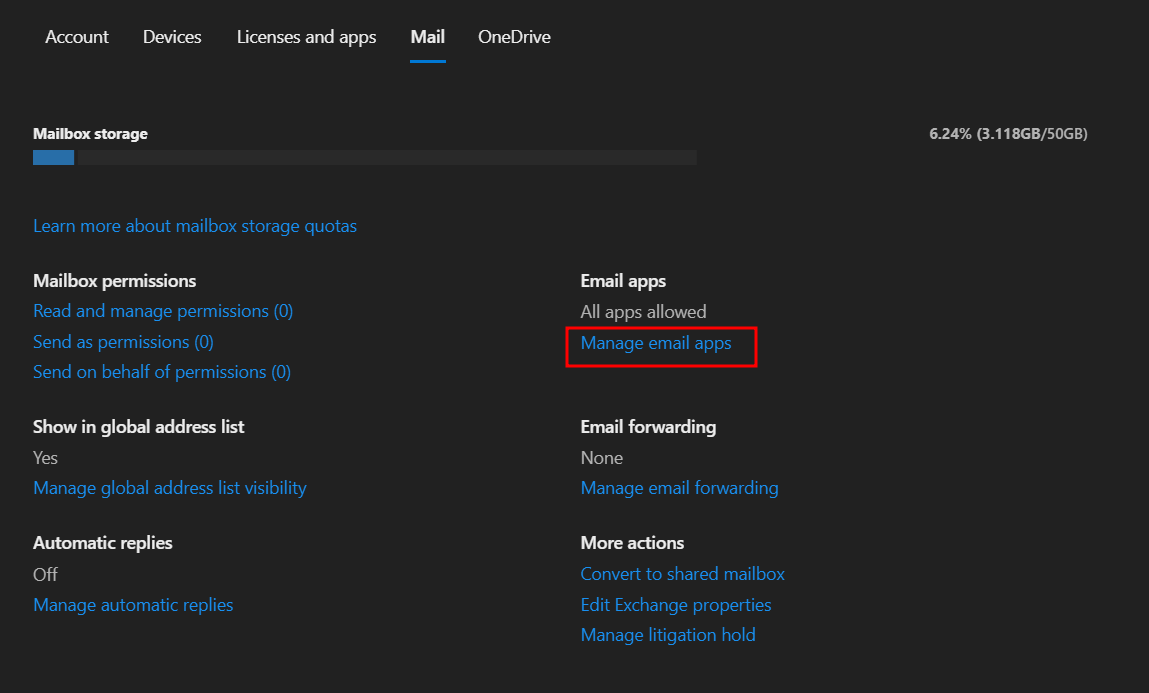 Go to admin.microsoft.com select a user with an activate license. Go to the users settings page, select mail and click on “Manage email apps“.