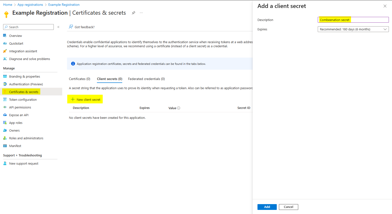 Open the Certificates & secrets page and click on New client secret.