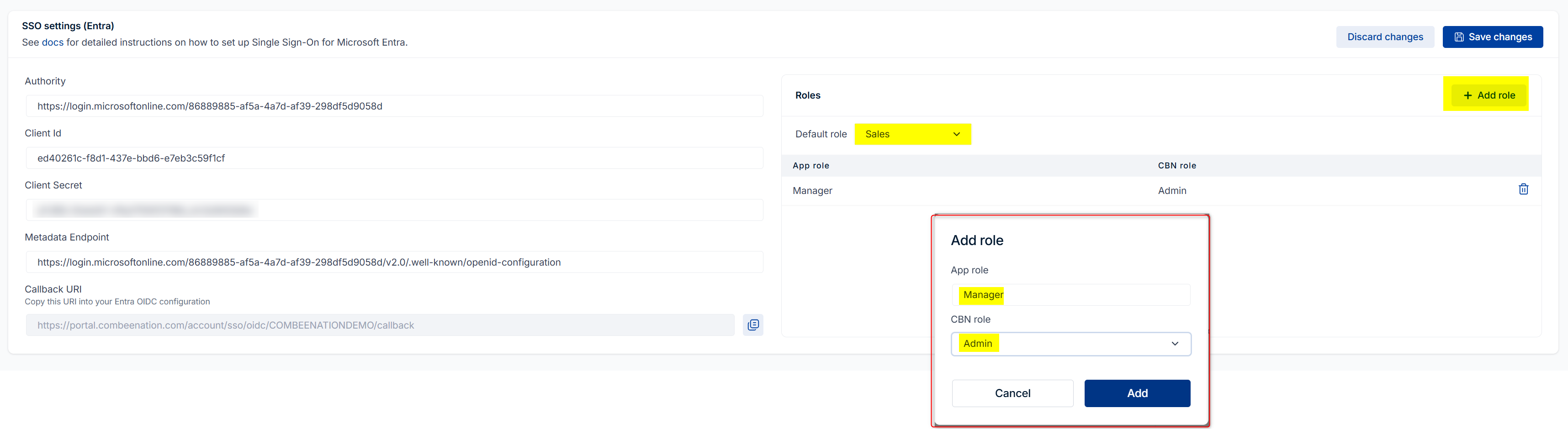 Next, click on Add role to create a mapping between an Entra App role and a Combeenation role.