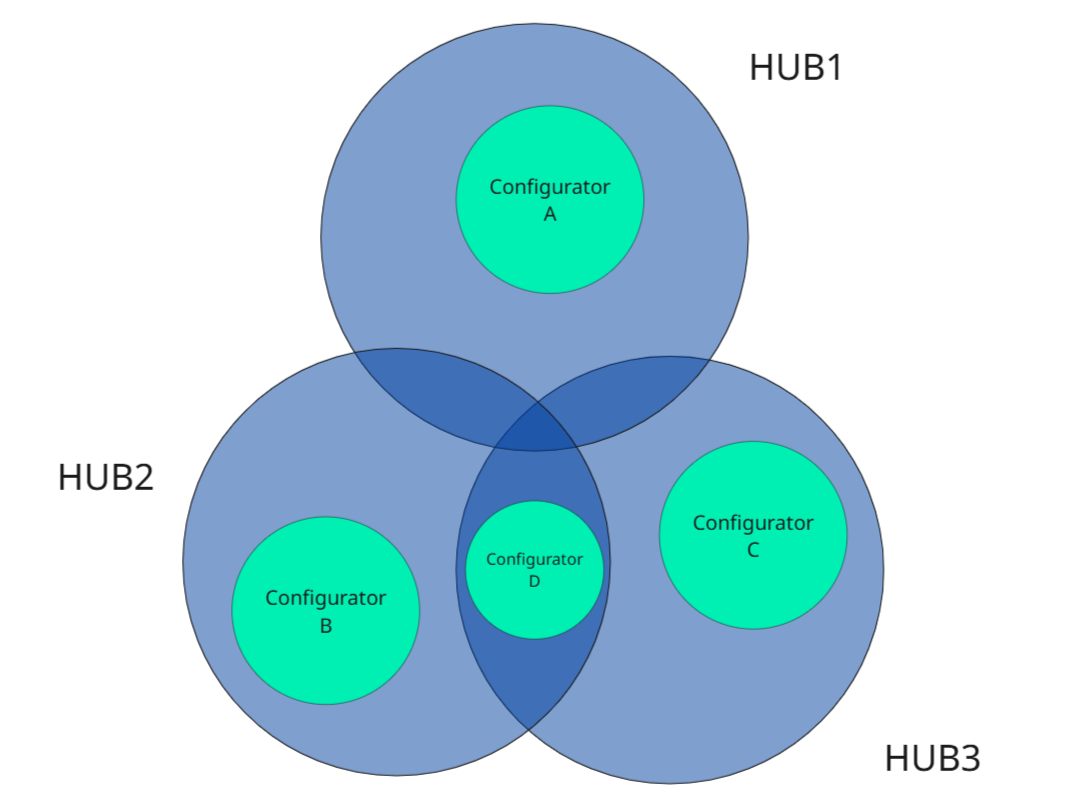 As previously described, every configurator can create quotes in any hub (see the quoteHubName property). In the following example, configurator A, B and C create quotes in their dedicated hubs, but configurator D creates quotes in HUB2 and HUB3. This allows you to create quotes from different configurators, but ensure the same number sequence described in the next section.