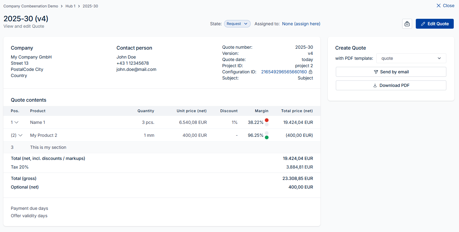 Once you have clicked on a dedicated quote, all details of this quote are shown. You can directly see the resulting quote PDF which is ready to be sent to your customer.