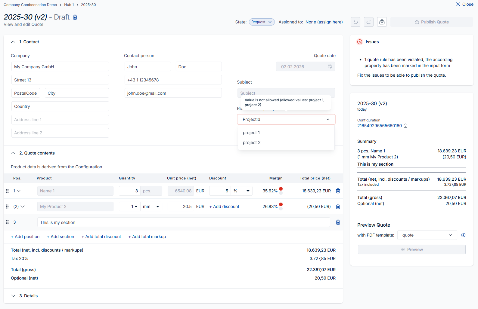 All properties which violate a quote rule are highlighted, check allowed values in the tooltip. If a quote contains issues, then it’s not possible to publish it.